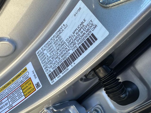 2026 Honda Accord Hybrid Sport Silver Metallic 2.0L I4 DOHC 16V, 4-Wheel Disc Brakes, 8 Speakers, ABS brakes, Adaptive Cruise Control: Adaptive Cruise Control (ACC) with Low-Speed Follow, Air Conditioning, Alloy wheels, AM/FM radio, Apple CarPlay/Android Auto, Auto High-beam Headlights, Automatic temperature control, Blind Spot Information (BSI) System warning, Brake assist, Bumpers: body-color, Compass, Delay-off headlights, Driver door bin, Driver vanity mirror, Dual front impact airbags, Dual front side impact airbags, Electronic Stability Control, Emergency communication system: HondaLink, Exterior Parking Camera Rear, Fabric Seat Trim, Four wheel independent suspension, Front anti-roll bar, Front Bucket Seats, Front Center Armrest, Front dual zone A/C, Front reading lights, Fully automatic headlights, Heated Front Bucket Seats, Heated front seats, Illuminated entry, Knee airbag, Lane departure: Lane Keeping Assist System (LKAS) active, Leather Shift Knob, Leather steering wheel, Low tire pressure warning, Occupant sensing airbag, Outside temperature display, Overhead airbag, Overhead console, Panic alarm, Passenger door bin, Passenger vanity mirror, Power door mirrors, Power driver seat, Power moonroof, Power steering, Power windows, Radio data system, Radio: 180-Watt Audio System, Rear anti-roll bar, Rear reading lights, Rear seat center armrest, Rear side impact airbag, Rear window defroster, Remote keyless entry, Security system, Speed control, Speed-sensing steering, Speed-Sensitive Wipers, Split folding rear seat, Spoiler, Steering wheel mounted audio controls, Telescoping steering wheel, Tilt steering wheel, Traction control, Trip computer, Variably intermittent wipers, and Wheels: 19" x 8.5J Berlina Black.