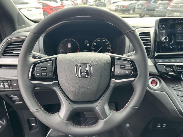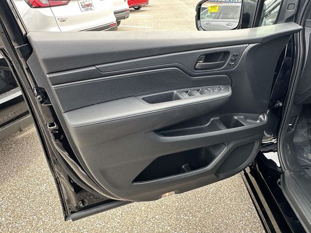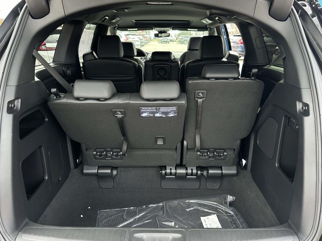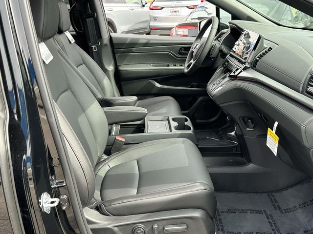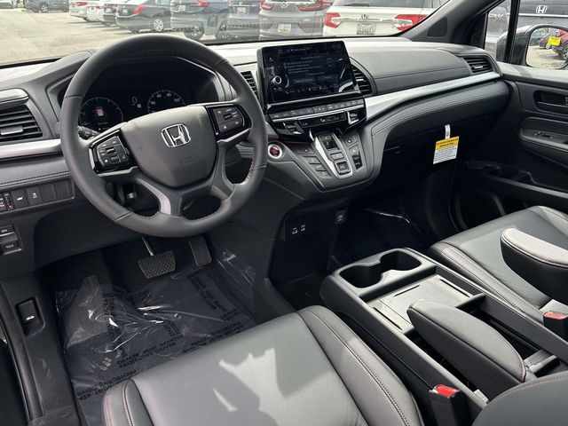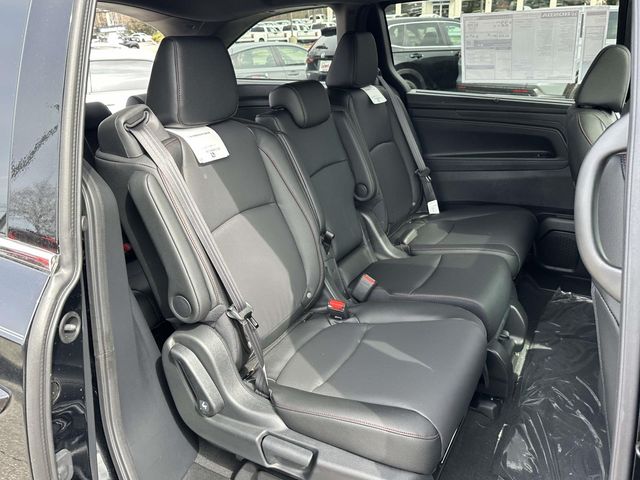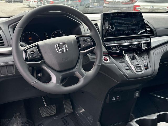 2026 Honda Odyssey Sport-L Crystal Black Pearl 3rd row seats: split-bench, 4-Wheel Disc Brakes, 7 Speakers, ABS brakes, Adaptive Cruise Control: Adaptive Cruise Control (ACC) with Low-Speed Follow, Air Conditioning, Alloy wheels, AM/FM radio: SiriusXM, Anti-whiplash front head restraints, Apple CarPlay/Android Auto, Auto High-beam Headlights, Auto-dimming Rear-View mirror, Automatic temperature control, Blind Spot Information (BSI) System warning, Brake assist, Bumpers: body-color, Delay-off headlights, Driver door bin, Driver vanity mirror, Driver's Seat Mounted Armrest, Dual front impact airbags, Dual front side impact airbags, Electronic Stability Control, Exterior Parking Camera Rear, Four wheel independent suspension, Front anti-roll bar, Front Bucket Seats, Front dual zone A/C, Front fog lights, Front reading lights, Fully automatic headlights, Garage door transmitter: HomeLink, Heated door mirrors, Heated Front Bucket Seats, Heated front seats, Illuminated entry, Knee airbag, Lane departure: Lane Keeping Assist System (LKAS) active, Leather steering wheel, Leather-Trimmed Seats, Low tire pressure warning, Memory seat, Occupant sensing airbag, Outside temperature display, Overhead airbag, Overhead console, Panic alarm, Passenger door bin, Passenger seat mounted armrest, Passenger vanity mirror, Power door mirrors, Power driver seat, Power Liftgate, Power moonroof, Power passenger seat, Power steering, Power windows, Radio data system, Radio: 160-Watt AM/FM/HD/SiriusXM Audio System, Rear air conditioning, Rear anti-roll bar, Rear reading lights, Rear seat center armrest, Rear window defroster, Rear window wiper, Reclining 3rd row seat, Remote keyless entry, Security system, Speed control, Speed-sensing steering, Speed-Sensitive Wipers, Split folding rear seat, Spoiler, Steering wheel mounted audio controls, Tachometer, Telescoping steering wheel, Tilt steering wheel, Traction control, Trip computer, Turn signal indicator mirrors, Variably intermittent wipers, and Wheels: 19" Gloss Black Alloy.