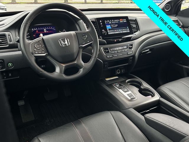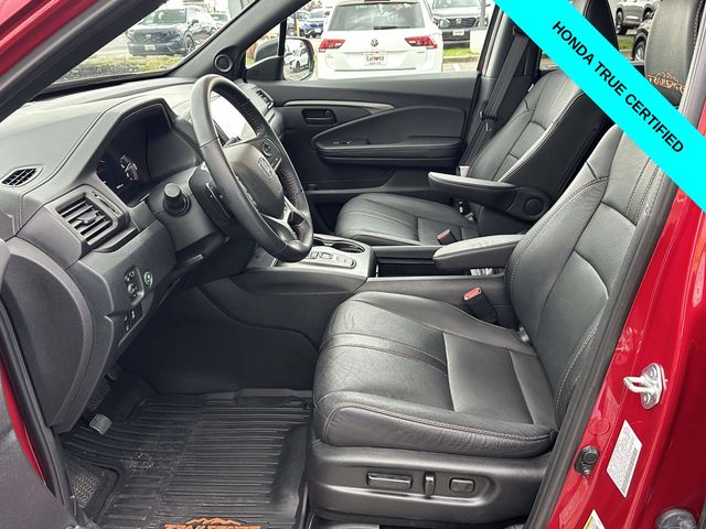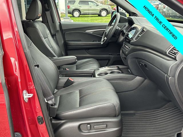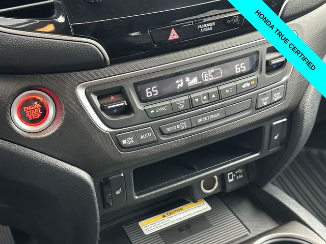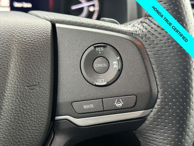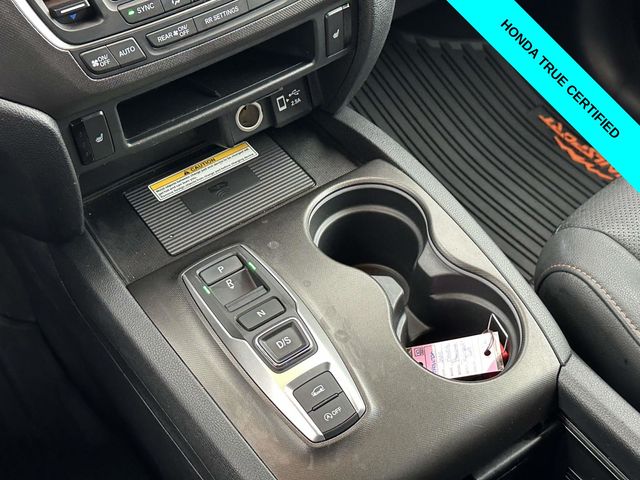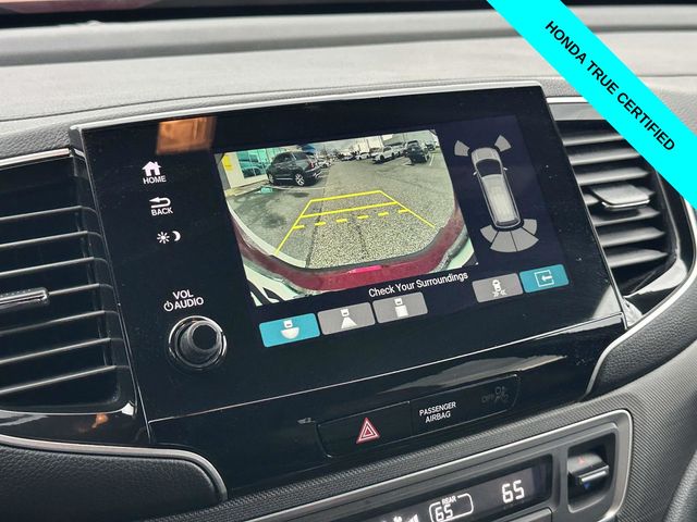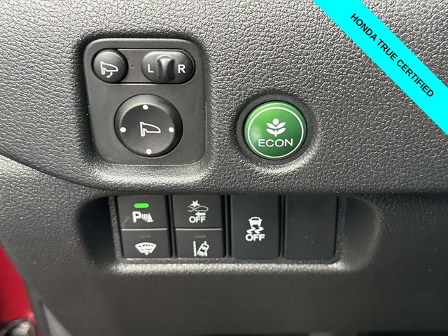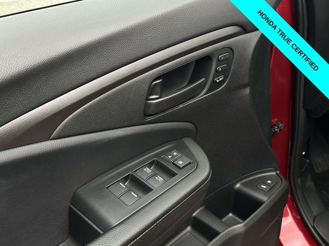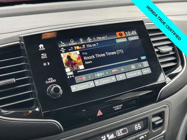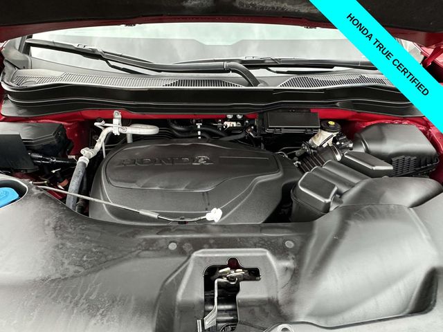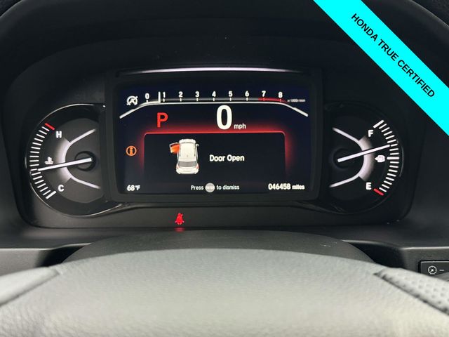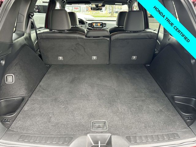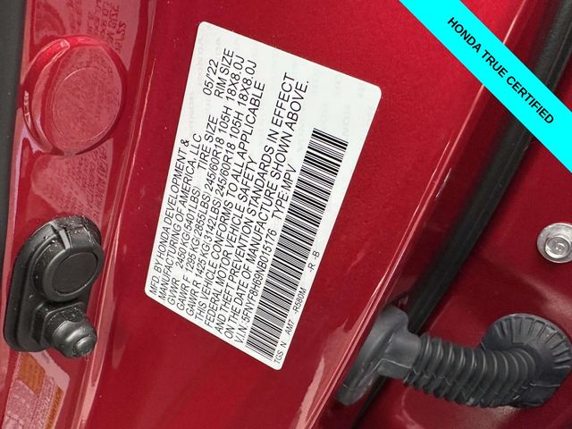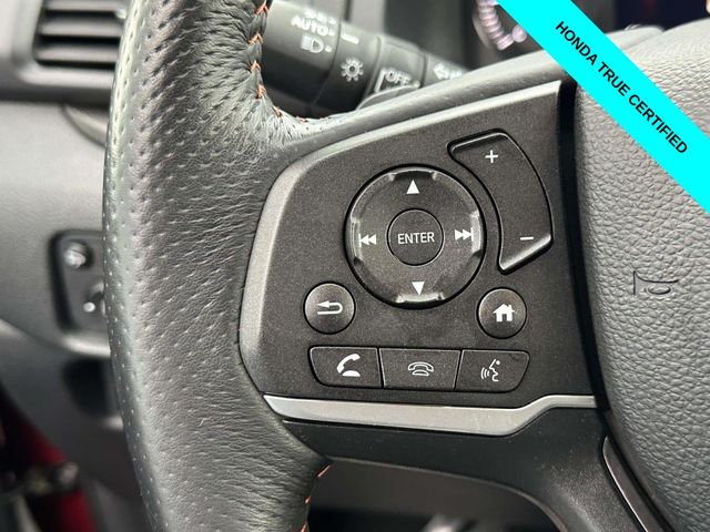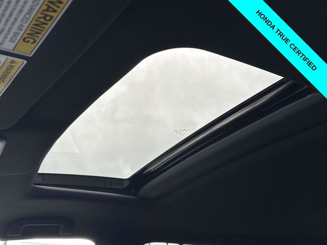 HondaTrue Certified Certified, Alloy wheels, Apple CarPlay/Android Auto, Blind Spot Information (BSI) System warning, Brake assist, Electronic Stability Control, Exterior Parking Camera Rear, Forward collision: Collision Mitigation Braking System (CMBS) + FCW mitigation, Heated front seats, Lane departure: Lane Keeping Assist System (LKAS) active, Leather-Trimmed Seats w/Orange Stitching, Memory seat, Navigation system: Honda Satellite-Linked Navigation System, Power Liftgate, Power moonroof, Wheels: 18" Machine-Finish Alloy, 4-Wheel Disc Brakes, 4.334 Axle Ratio, 7 Speakers, A/V remote: CabinControl, ABS brakes, Air Conditioning, AM/FM radio: SiriusXM, Auto High-beam Headlights, Auto-dimming Rear-View mirror, Automatic temperature control, Bumpers: body-color, Compass, Delay-off headlights, Driver door bin, Driver vanity mirror, Driver's Seat Mounted Armrest, Dual front impact airbags, Dual front side impact airbags, Emergency communication system: HondaLink Assist, Four wheel independent suspension, Front anti-roll bar, Front Bucket Seats, Front Center Armrest, Front dual zone A/C, Front fog lights, Front reading lights, Fully automatic headlights, Garage door transmitter: HomeLink, Heated door mirrors, Heated Front Bucket Seats, Illuminated entry, Low tire pressure warning, Occupant sensing airbag, Outside temperature display, Overhead airbag, Overhead console, Panic alarm, Passenger door bin, Passenger seat mounted armrest, Passenger vanity mirror, Power door mirrors, Power driver seat, Power passenger seat, Power steering, Power windows, Radio data system, Radio: 215-Watt Audio System w/7 Speakers, Rear air conditioning, Rear anti-roll bar, Rear reading lights, Rear seat center armrest, Rear window defroster, Rear window wiper, Remote keyless entry, Roof rack: rails only, Security system, Speed control, Speed-sensing steering, Split folding rear seat, Spoiler, Steering wheel mounted audio controls, Tachometer, Telescoping steering wheel, Tilt steering wheel, Traction control, Trip computer, Turn signal indicator mirrors, and Variably intermittent wipers.