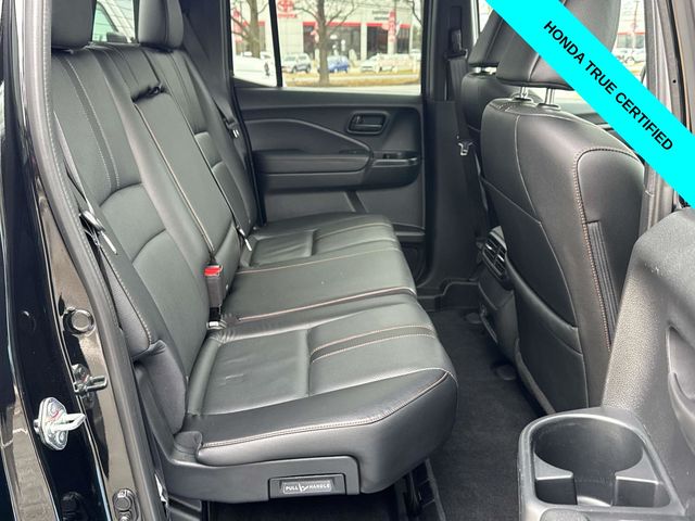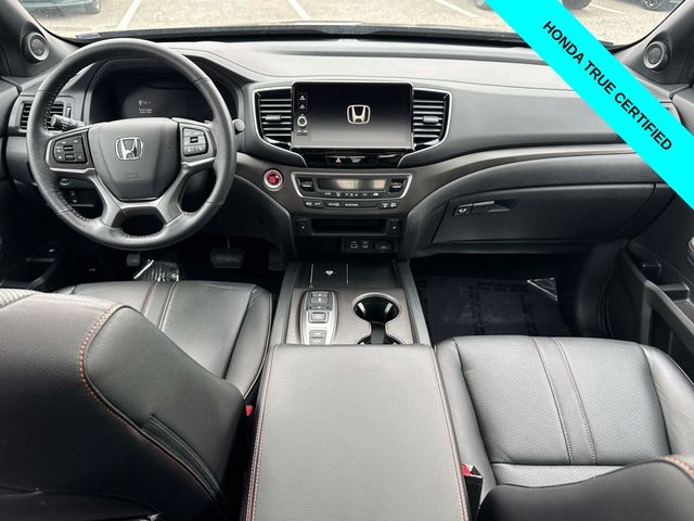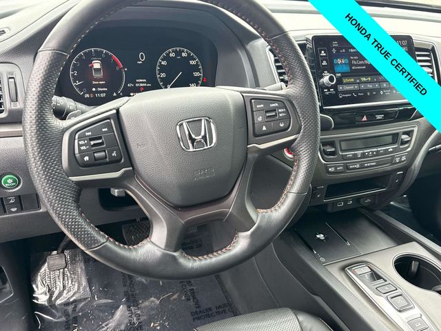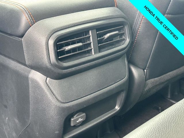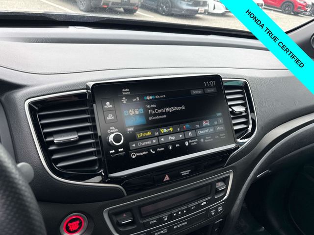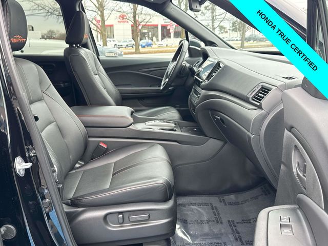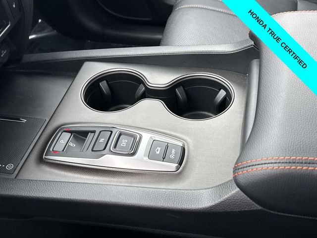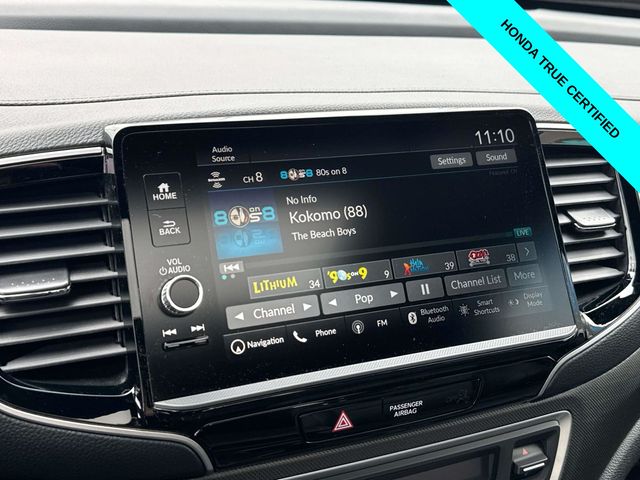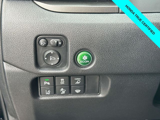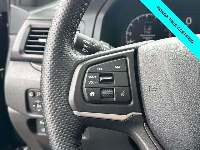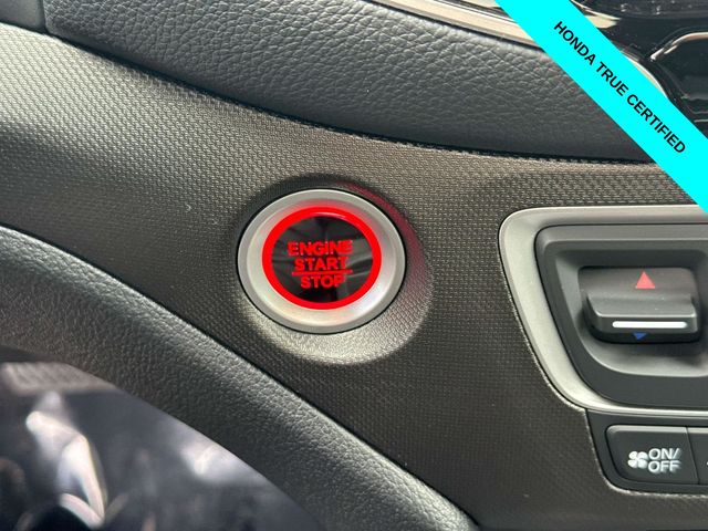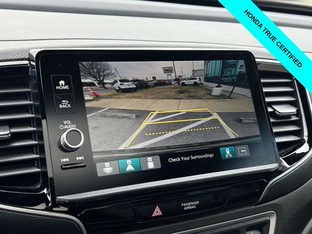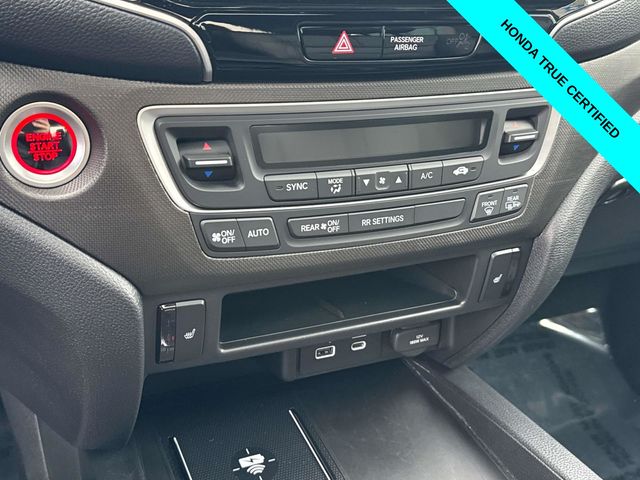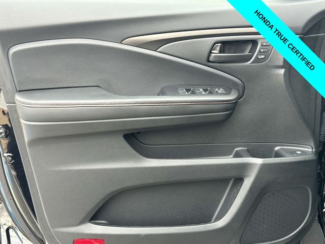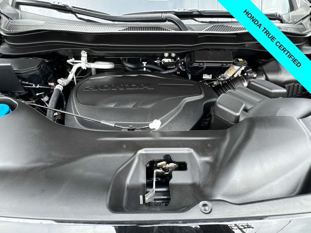 HondaTrue Certified Certified, Black w/Leatherette Seat Trim, Alloy wheels, Blind Spot Information (BSI) System warning, Brake assist, Electronic Stability Control, Exterior Parking Camera Rear, Heated front seats, Honda Satellite-Linked Navigation System, Leatherette Seat Trim, Memory seat, Navigation system: Honda Satellite-Linked Navigation System, Power moonroof, Power passenger seat, Wheels: 18" TrailSport Pewter Gray Alloy, 4-Wheel Disc Brakes, 4.33 Axle Ratio, 7 Speakers, ABS brakes, Air Conditioning, AM/FM radio: SiriusXM, Auto-dimming Rear-View mirror, Automatic temperature control, Bluetooth Hands-Free Link, Bumpers: body-color, Compass, Delay-off headlights, Driver door bin, Driver vanity mirror, Driver's Seat Mounted Armrest, Dual front impact airbags, Dual front side impact airbags, Emergency communication system: HondaLink Assist, Four wheel independent suspension, Front anti-roll bar, Front Bucket Seats, Front dual zone A/C, Front fog lights, Front reading lights, Fully automatic headlights, Garage door transmitter: HomeLink, Heated door mirrors, Heated Front Bucket Seats, Illuminated entry, Leather steering wheel, Low tire pressure warning, Occupant sensing airbag, Outside temperature display, Overhead airbag, Overhead console, Panic alarm, Passenger door bin, Passenger seat mounted armrest, Passenger vanity mirror, Power door mirrors, Power driver seat, Power steering, Power windows, Radio data system, Radio: 215-Watt Audio System w/7 Speakers, Rear air conditioning, Rear anti-roll bar, Rear reading lights, Rear seat center armrest, Rear step bumper, Rear window defroster, Remote keyless entry, Security system, SiriusXM, Speed control, Speed-sensing steering, Split folding rear seat, Steering wheel mounted audio controls, Tachometer, Telescoping steering wheel, Tilt steering wheel, Traction control, Trip computer, Turn signal indicator mirrors, Variably intermittent wipers, and Wireless Apple CarPlay/Wireless Android Auto.