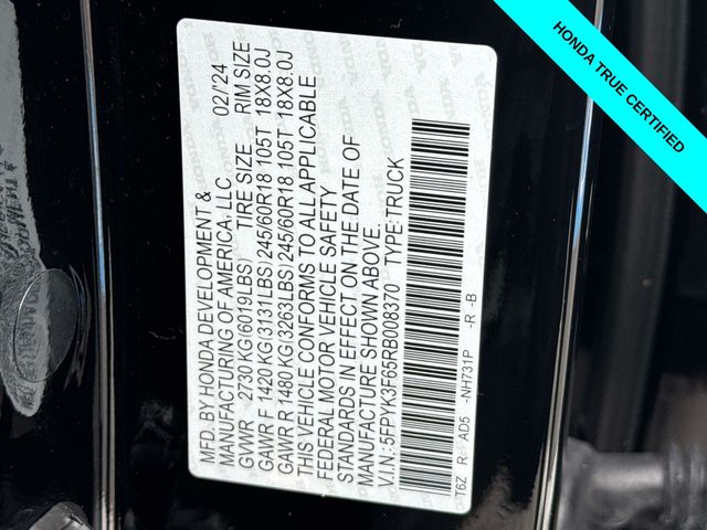 Certified. CARFAX One-Owner. Clean CARFAX. Crystal Black Pearl 2024 Honda Ridgeline TrailSport 4D Crew Cab AWD AWD 9-Speed Automatic 3.5L V6 SOHC i-VTEC 24V
